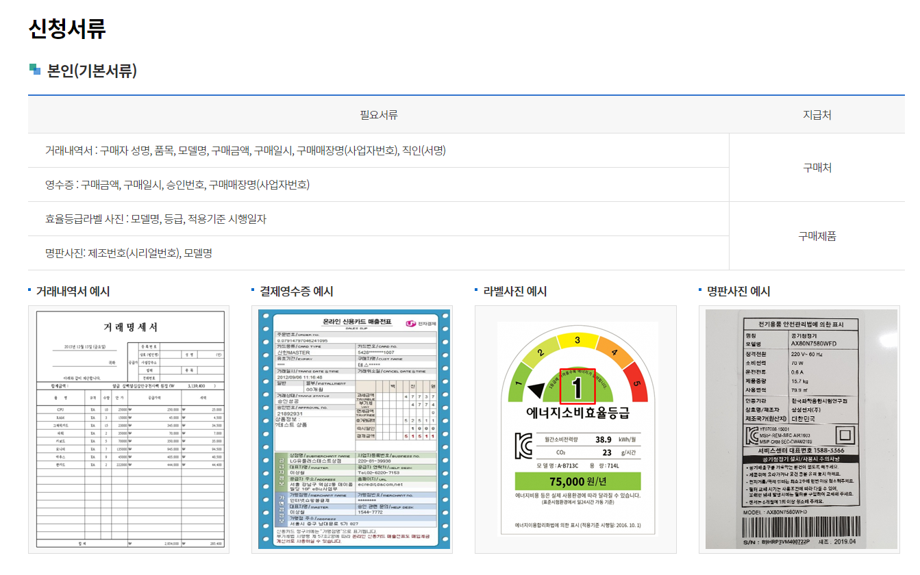 거래내역서와 영수증을 받아야 합니다. 거래내역서 : 구매자 성명, 품목, 모델명, 상호(사업자번호), 구매금액, 구매일자, 직인(서명) 포함 영수증(카드매출전표 또는 현금영수증) : 구매금액, 구