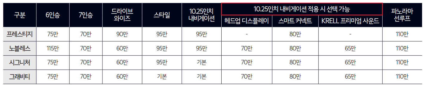 좌측부터 보시면 6인승 시트 변경 ~ 파노라마 선루프까지 각 트림별로 가격이 다 다른것을 확인할 수 있습니다.