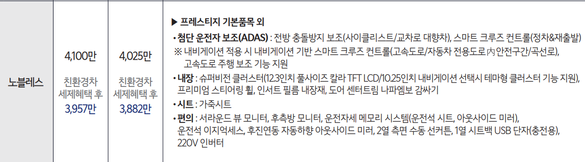 상단에 이미지를 보시면 노블레스 트림은 프레스티지 트림에서 가지고 있는 점을