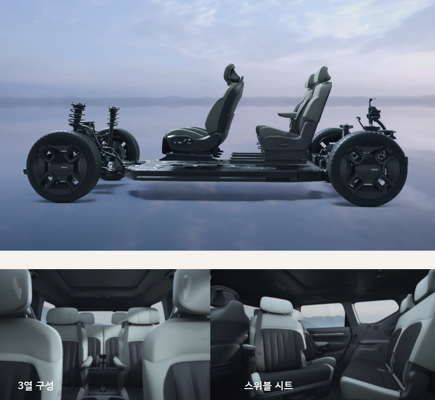 EV9의 실내는 편평한 바닥과 긴 휠베이스 등 전기차 전용 플랫폼 E-GMP의 장점을 적극 활용해 설계가 되었다고 합니다.